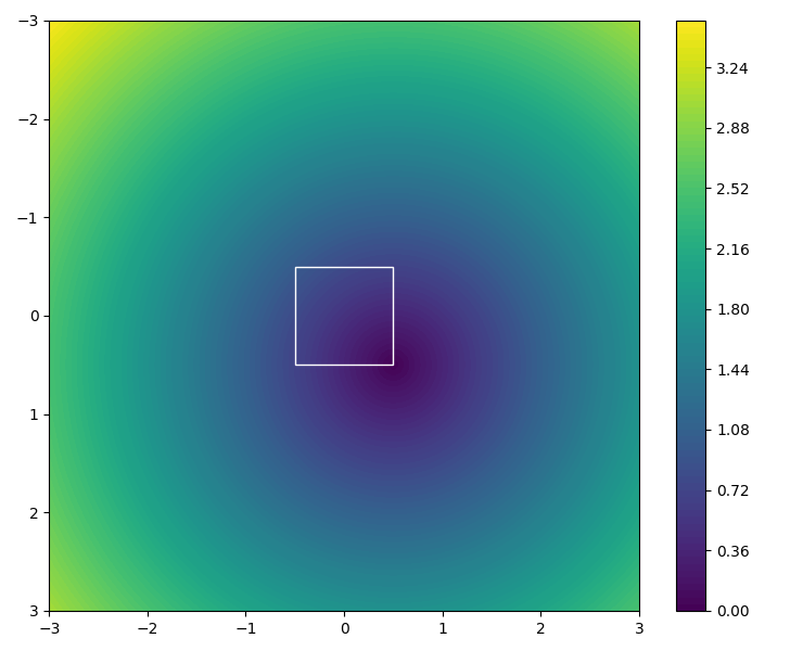 Visualization of the scale_function function for a 1x1 unit square, with varying x and y. (xOrigin * shape_width, yOrigin * shape_height)defines the origin of the radial gradient relative to the center of the shape.- The radius is